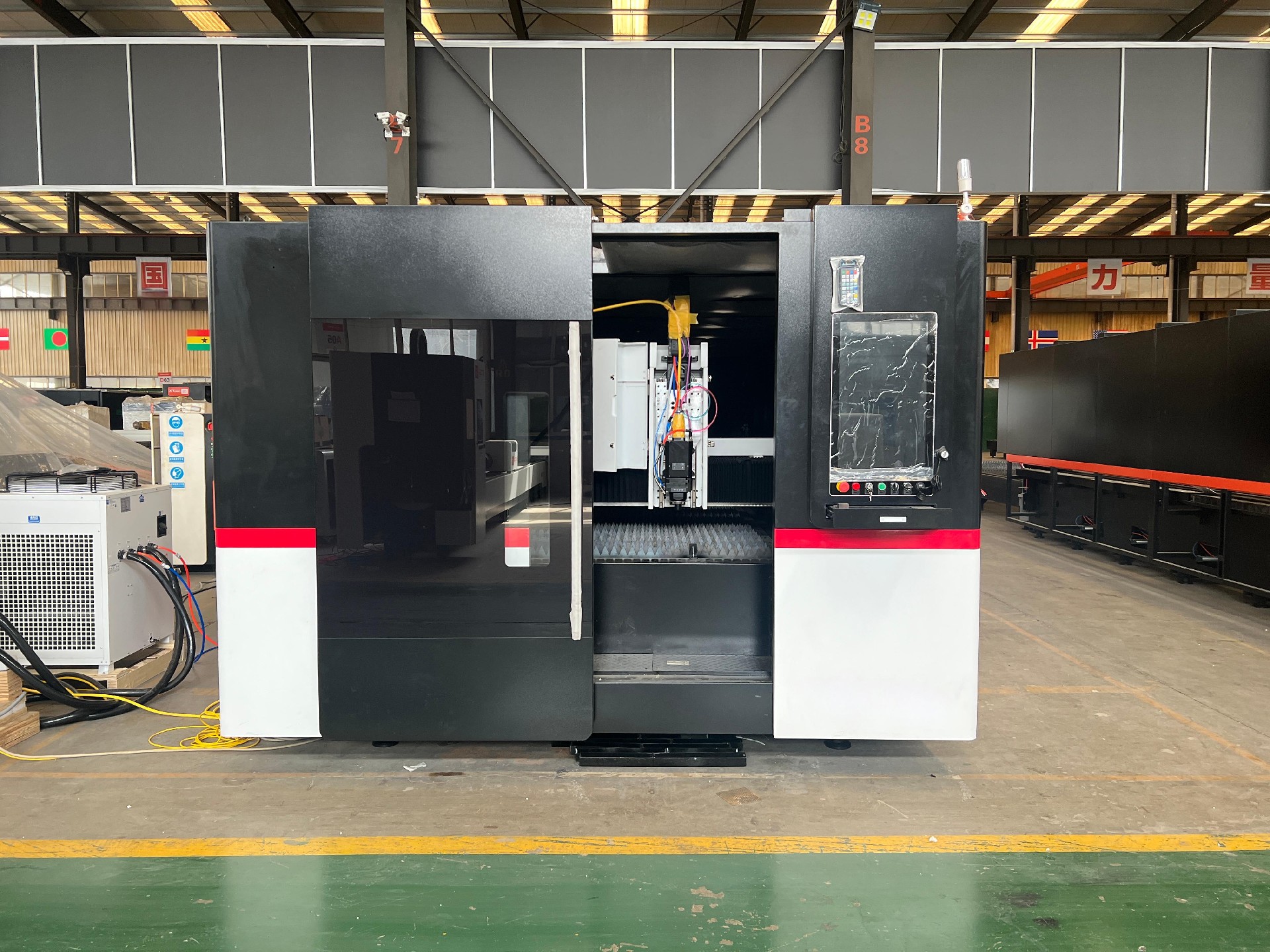 Fiber laser plate cutting machine with doube table and full enclosed cover , widely used for metal working , advertising ,car processing ect industry .