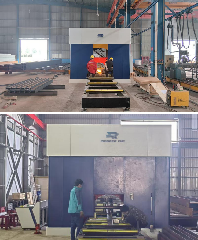 Laser h beam cutting machine production line , include cutting unit , feeding in roller , feeding out roller , auto loading and unloading part . It can cut h beam , angle beam , I beam , channel beam ,match 12kw , 20kw , 30kw laser source .